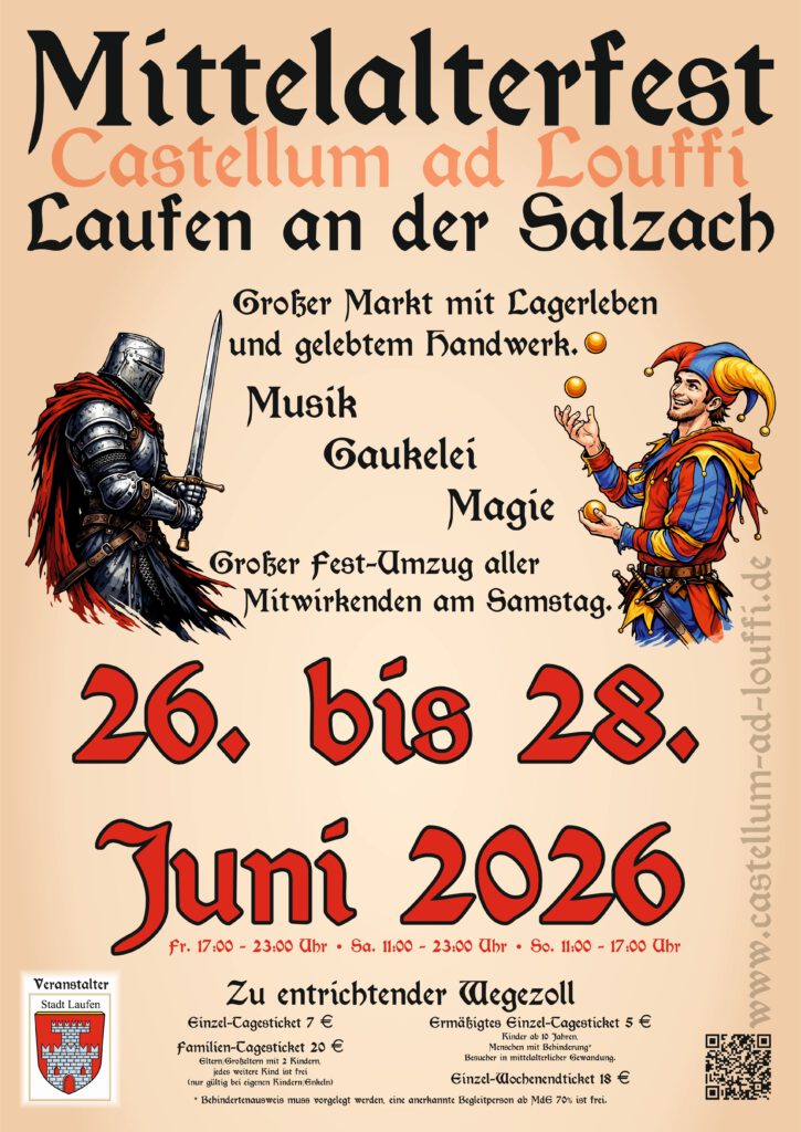 Das “Castellum ad Louffi” geht in eine weitere Runde. Von 26. – 28. Juni 2026 lädt die Stadt Laufen wieder ein, in die Welt des Mittelalters einzutauchen.